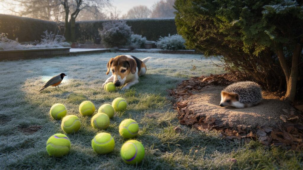 Redirect pet attention Tennis balls placed in open areas attract dogs and cats away from hedges and shelters Fewer disturbances for hedgehogs and birds, without restricting pets