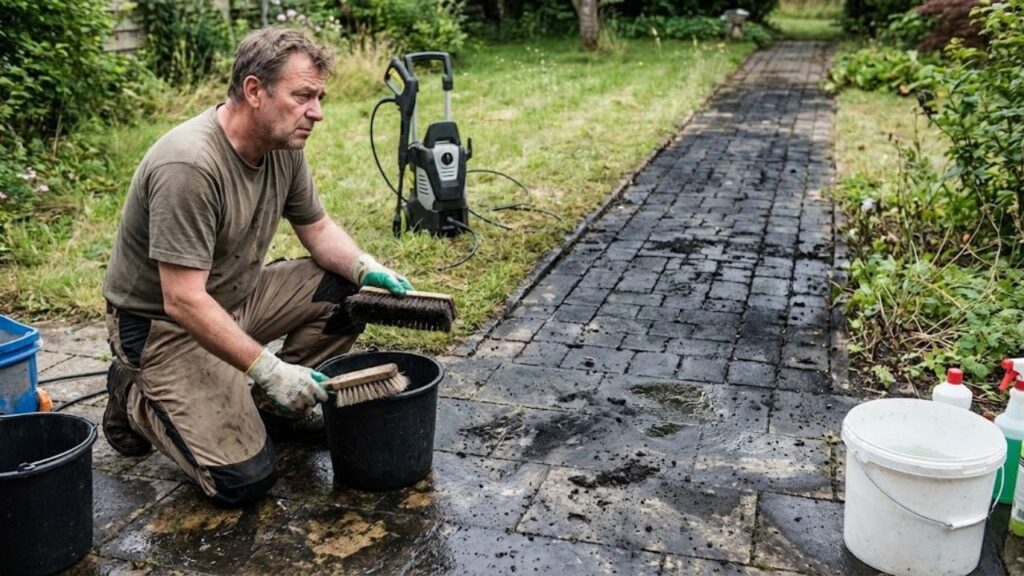 Gentler cleaning methods move slower but offer consistency. Warm water, a suitable outdoor cleaner or diluted soda crystals, and a medium-bristle broom dissolve grease and organic buildup without attacking the surface. You work section by section, rinse calmly, and spread the effort over time.