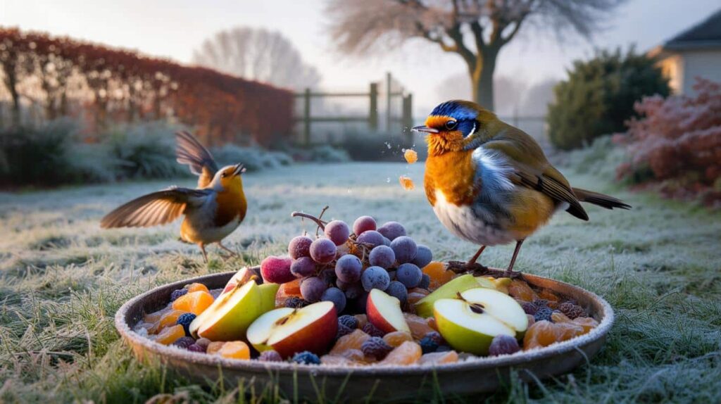 Now picture the same garden, same hour, but with a splash of orange, red, and purple on the ground. Slices of apple, scattered raisins, halved grapes glistening with frost. The robin doesn’t hesitate. It drops straight down, shoulders hunched against the cold, and starts feeding with the focus of someone who’s just found the last open bakery in a snowstorm.