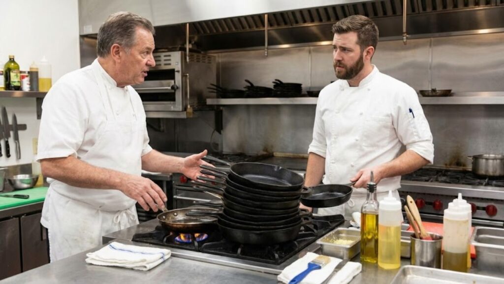 In a Chicago steakhouse, two senior cooks once tested this quietly. They stripped two identical skillets to bare metal using steel wool and vinegar. One pan went through a classic high-heat routine in a scorching oven, oil near its smoke point. The other received multiple gentle cycles at lower temperatures across several days.