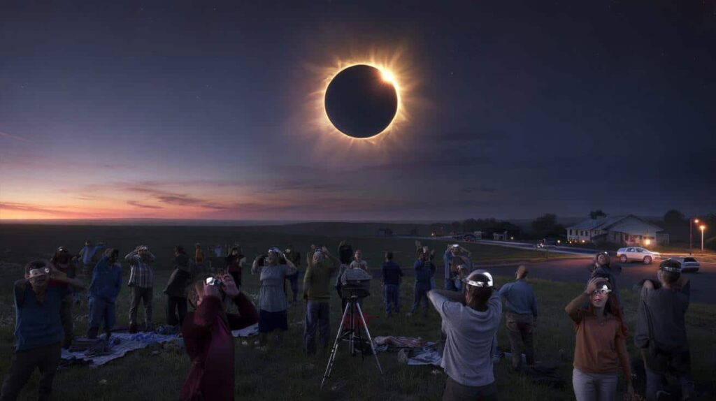 The light starts to feel wrong before anyone can explain why. Colors turn slightly metallic, like a filter has slipped over the world, and birds go quiet in the middle of their own song. In a small town on the edge of the path of totality, people spill out of offices and kitchens, holding cardboard eclipse glasses and half-finished coffees, staring up at a sun that suddenly looks smaller, bitten from one side.