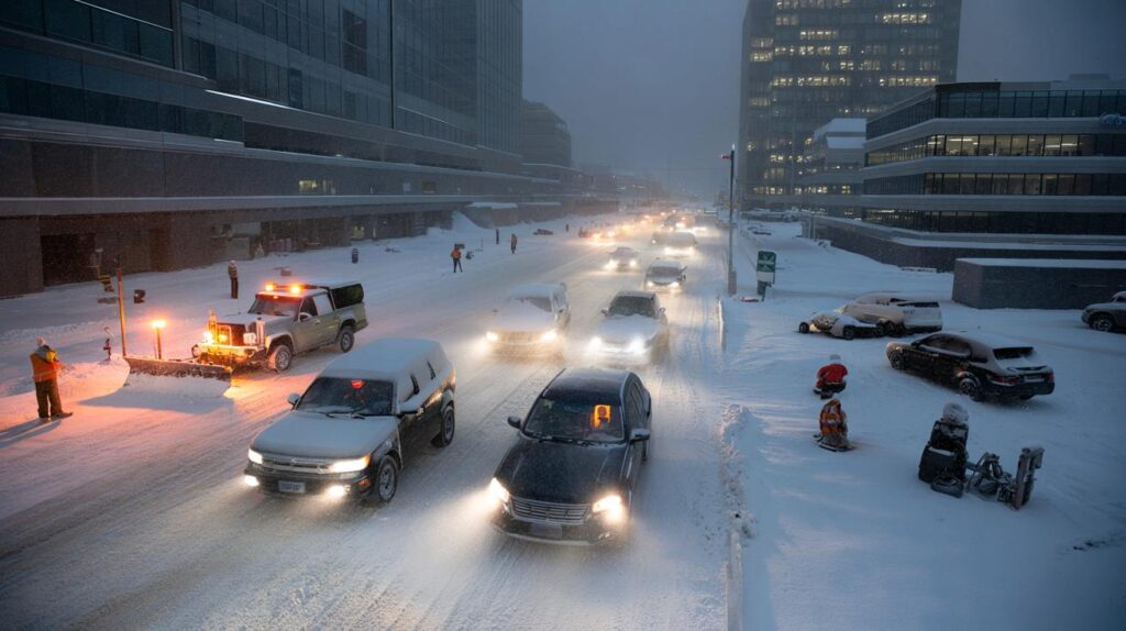 At 5:42 p.m., the first flakes look almost harmless under the streetlights. People are still rushing out of grocery stores with last-minute bread and milk, phones glowing with weather alerts, car keys already in hand. The air has that heavy, muffled quality that only comes before a real snow — the kind that doesn’t just decorate the city, it shuts it down.