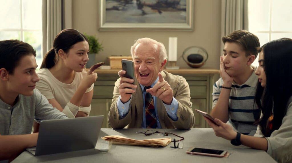 She instantly braces for a lecture on phones, music, or “kids these days.” By the time he’s reached the price of bread in 1973, half the table is scrolling under the tablecloth.